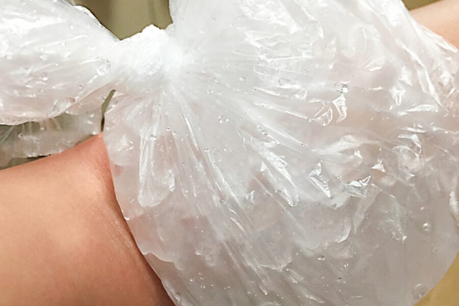ビニール袋に入れた氷や保冷剤などで患部を冷却します。痛みが軽減するまで20分程度冷やし、これを数時間おきに繰り返します。これにより血管が収縮し、内出血の拡大を防ぎます。
